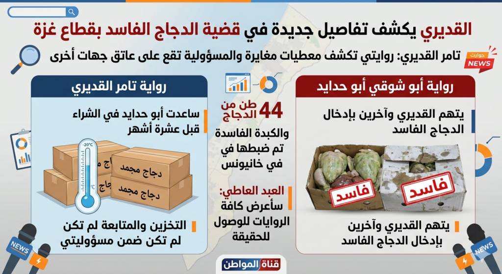 طالب رئيس تحرير قناة المواطن الإعلامي، عبد الحميد عبد العاطي، وزارة الاقتصاد في قطاع غزة بإصدار بيان عاجل وشفاف يوضح ملابسات قضية “الدجاج الفاسد”، في ظل ما تمثله من تهديد مباشر لصحة المواطنين وثقتهم بجهات الرقابة على الأسواق، واصفًا إياها بأنها “أول اختبار حقيقي في مرحلة ما بعد الحرب”.