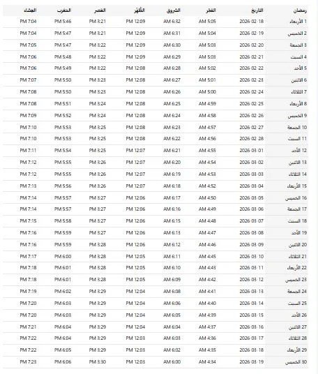 إمساكية رمضان 2026 مصر تبدأ ساعات الصيام في أول أيام رمضان بمدة 13 ساعة و2 دقيقة، مع أذان الفجر في 5:04 صباحاً والمغرب في 5:47 مساءً.