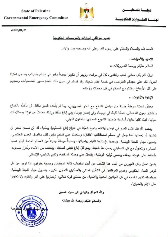 أصدرت لجنة الطوارئ الحكومية بغزة اليوم الأحد 25 يناير 2026، تعميماً إلى جميع موظفي الوزارات والمؤسسات الحكومية، في الشقين المدني والعسكري، أكدت خلاله على بدء مرحلة جديدة لخدمة الشعب الفلسطيني، مع التركيز على عملية تسليم وتسلم سلسة ومُنظمة لكافة مفاصل العمل الحكومي.
